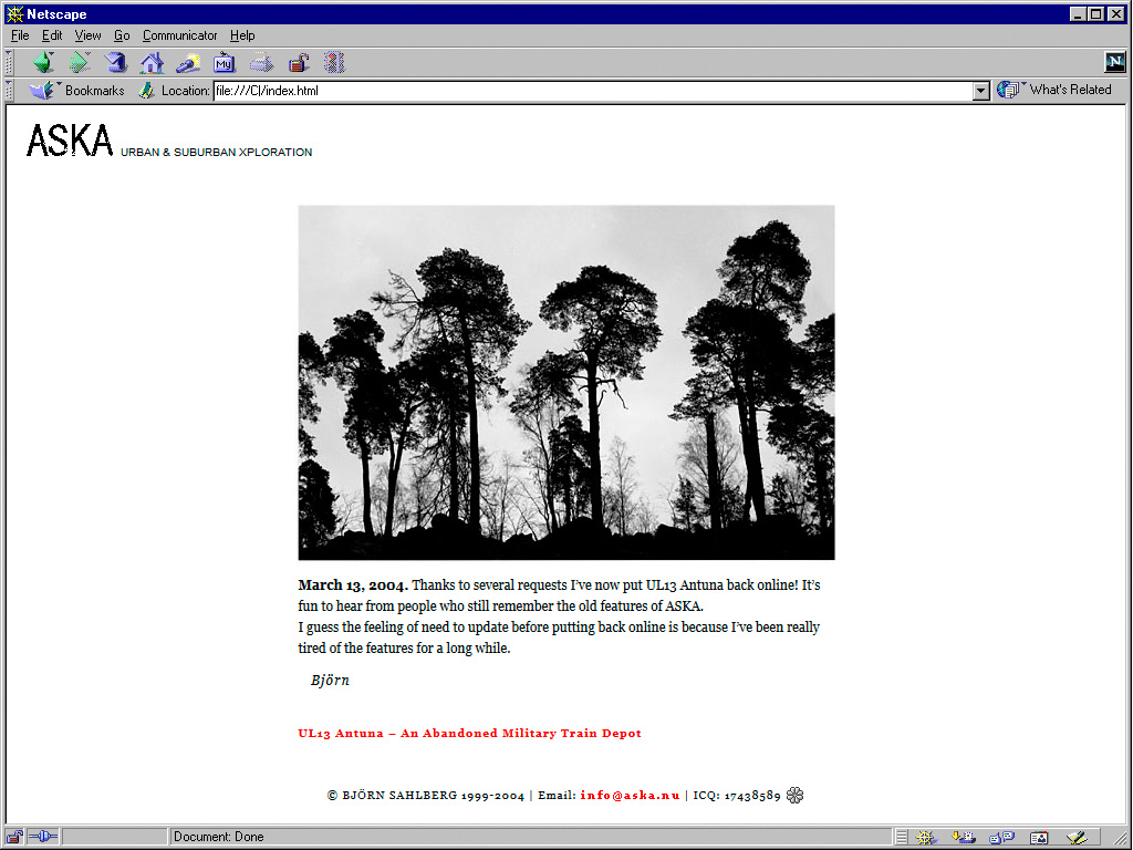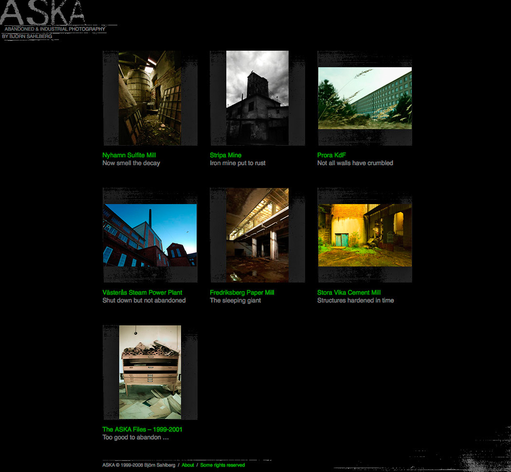 ASKA is the slowly growing collection of photographs from abandoned, quaint or interesting locations by me, Björn Sahlberg. The home base is Stockholm, Sweden.